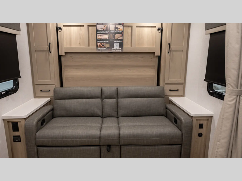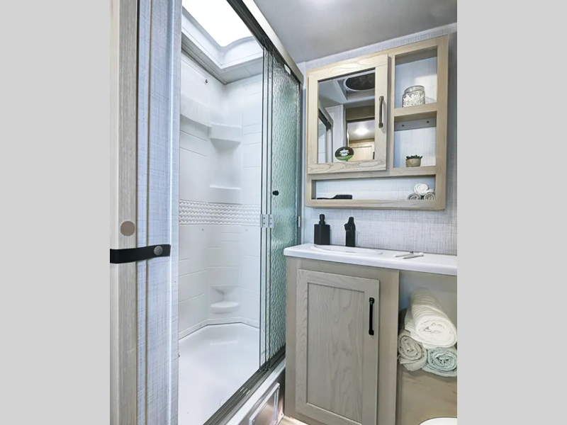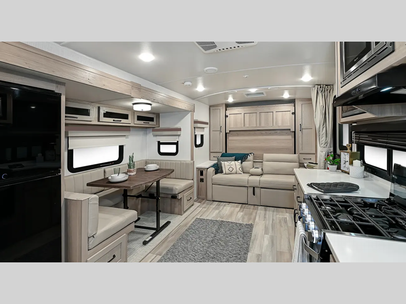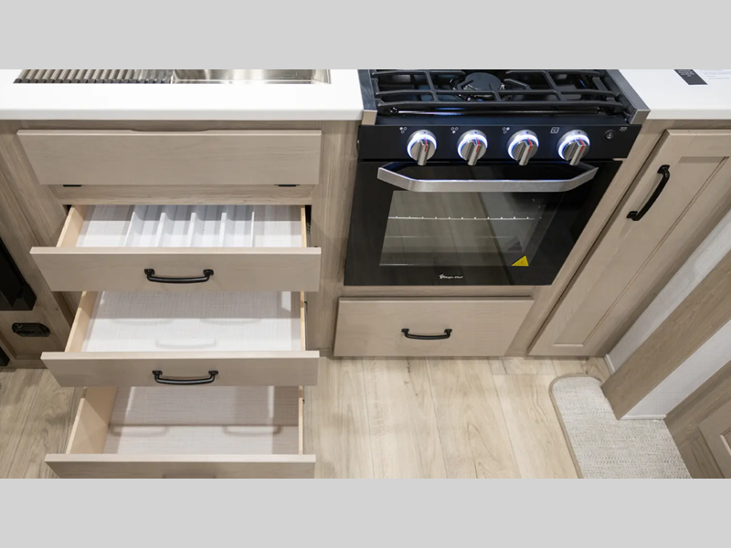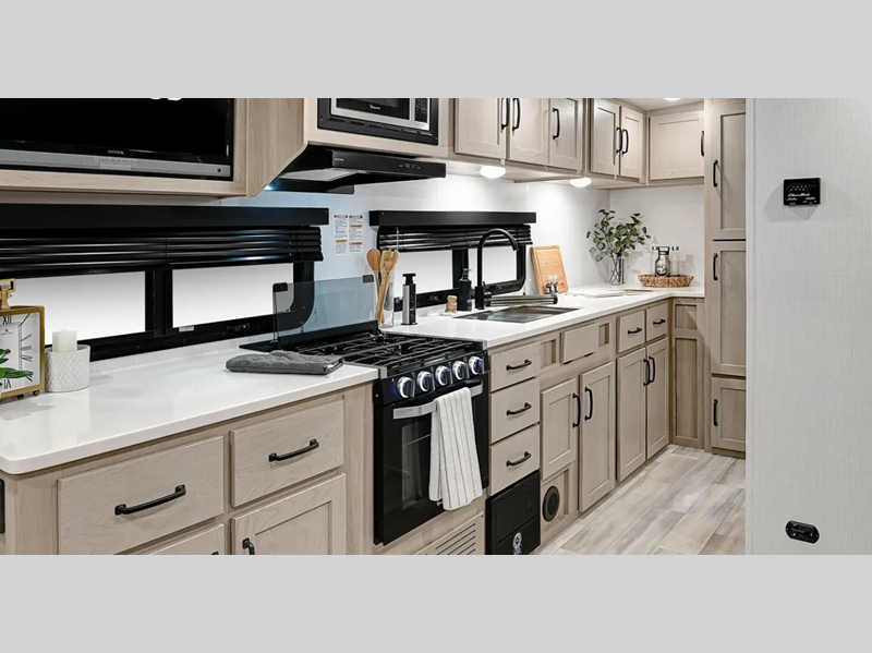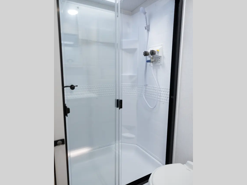 Each travel trailer will have you feeling right at home with its hidden hinge cabinet doors, plus solid surface kitchen countertops and roller shades for added privacy. The Showermiser water saving system is sure to come in handy while camping over the weekend, and the TV with a stereo ensures you'll never go bored. Towing is made hassle-free thanks to the power tongue jack, along with Dexter Torflex axles and Goodyear Endurance tires.