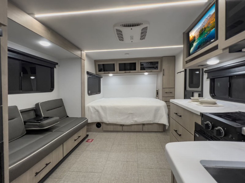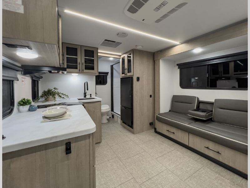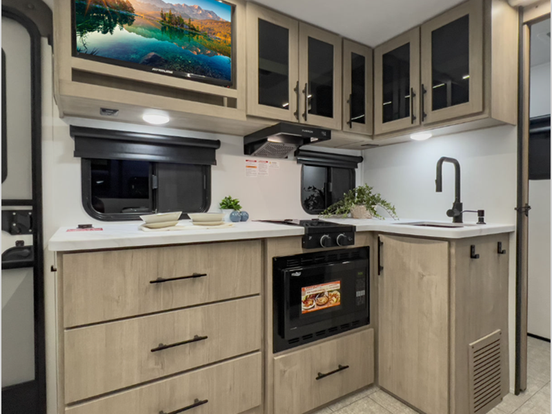 The gel coated fiberglass exterior is sure to turn heads at the campsite, and the spare tire and carrier will come in handy. You will also love the four included packages, such as the AIM Solar Package with off-grid features and the AIM Four Seasons Protection Package to keep you comfortable all year long! There is even an optional AIM Enhancement Package for even more convenience!