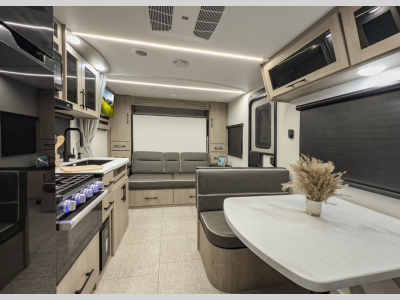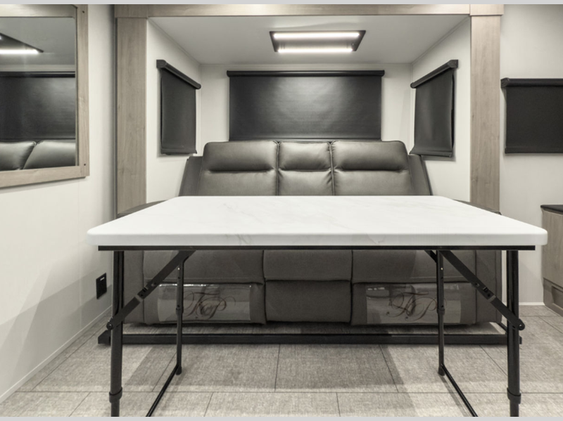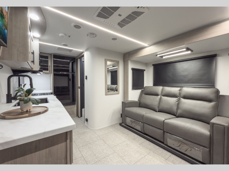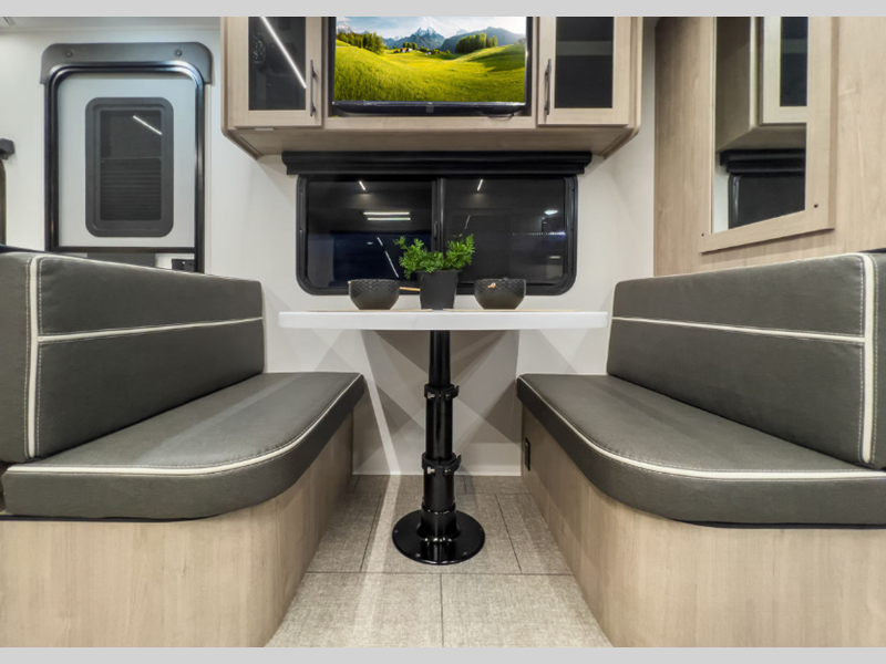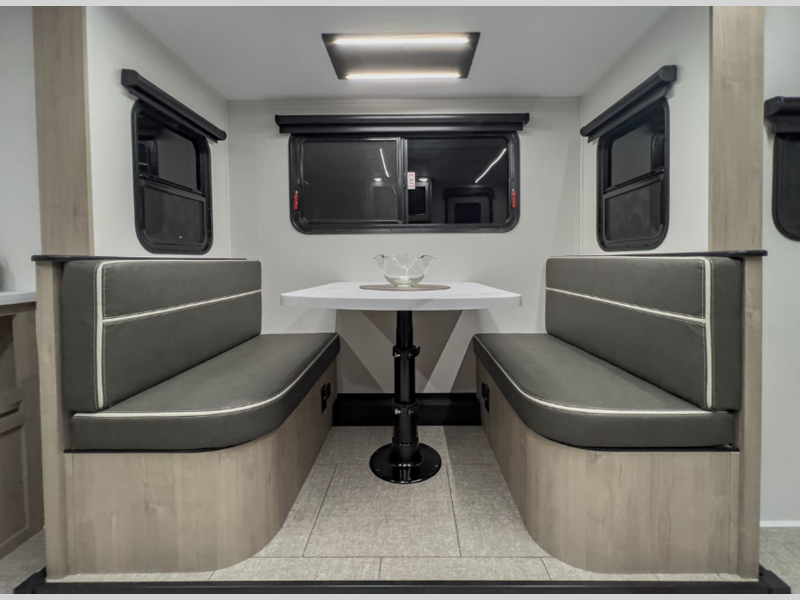 The gel-coated fiberglass exterior and one-piece roof membrane form the base that holds all of the many features, like the three-burner range with an oven, residential walk-in shower, high capacity furnace, and LED HDTV. The friction-hinge entry door won't fly away when you open it, and the residential countertops will let you set down dinner plates. There is a large panoramic window and LED lighting to keep your trailer feeling open, and the four packages included will provide even more features you won't want to camp without. Some of these features include a 200W solar panel, a 2" accessory hitch, and a full width pass-thru storage!