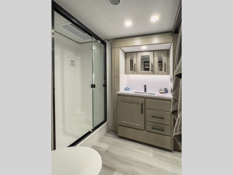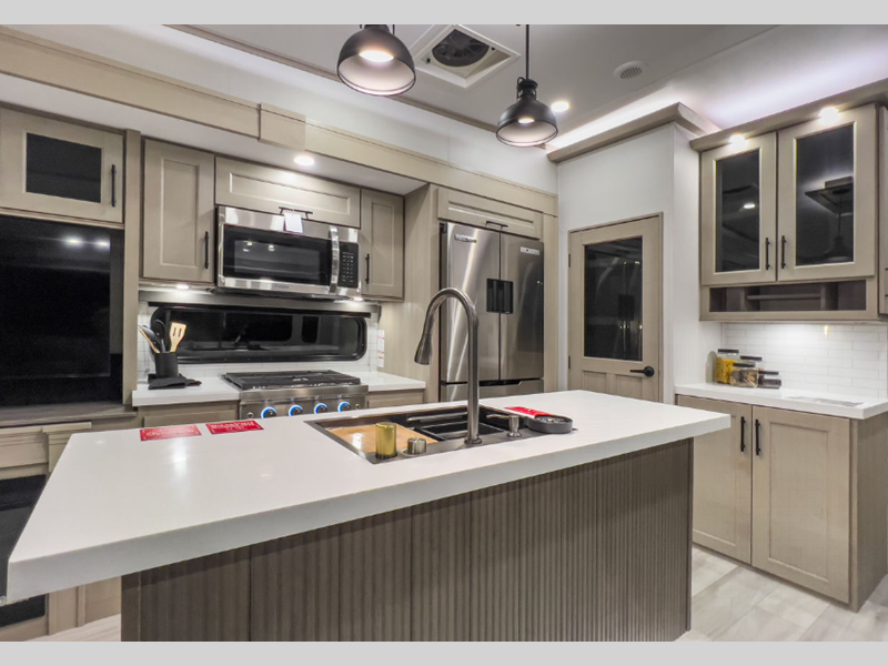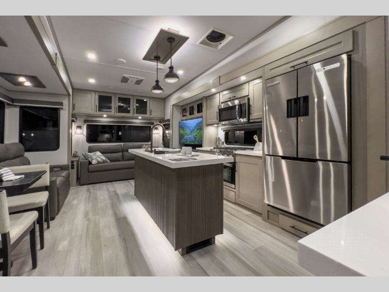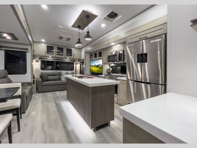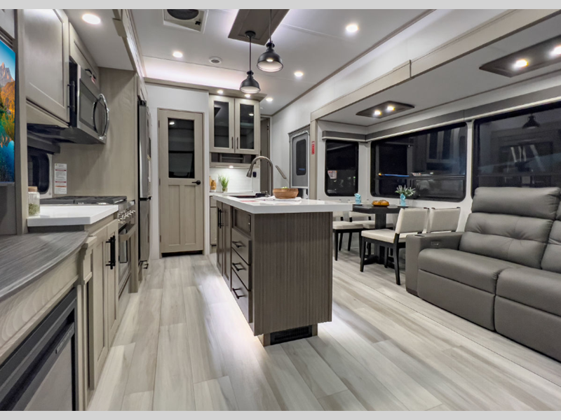 The exclusive Superchassis provides five more inches of width than many fifth wheels in this class which allows you more space to move, breathe, and live. You will enjoy wider sofas in rear lounge models, and space saving doors in all bathrooms. These features give you the space you want without having to add to your tow length. The fully laminated walls and thermal roof design, plus insulated baggage doors and Rail-Tite underbelly seal, ensures your unit is fully insulated including an underbelly with heated tanks and storage so that you can travel in all types of weather easily.