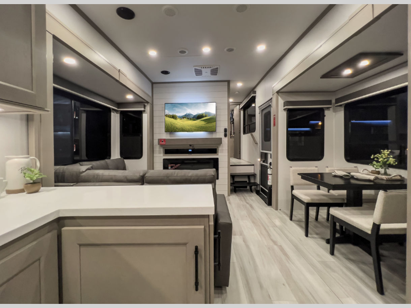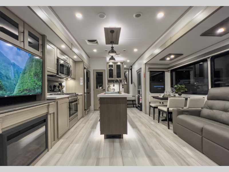 Sleeps 4 Slides 3 Length 34 ft 4 in Ext Width 8 ft 5 in Ext Height 13 ft 5 in Int Height 8 ft 5 in Hitch Weight 2190 lbs GVWR 15000 lbs Dry Weight 11800 lbs Fresh Water Capacity 81 gals Grey Water Capacity 106 gals Black Water Capacity 53 gals Tire Size ST215/75R 17.5 LRH Furnace BTU 35000 btu Available Beds Queen Refrigerator Type 12 Volt Refrigerator Size 16 cu ft Cooktop Burners 3 Shower Size 48" x 30" Number of Awnings 2 Axle Weight 7000 lbs LP Tank Capacity 30 lbs Water Heater Type Tankless AC BTU 15000 btu TV Info LR 40" LED Smart TV, BR LED TV Awning Info 11' and 16' Power w/Integrated LED Lighting Axle Count 2 Washer/Dryer Available Yes Number of LP Tanks 2 Shower Type Standard Electrical Service 50 amp Similar Floorplans