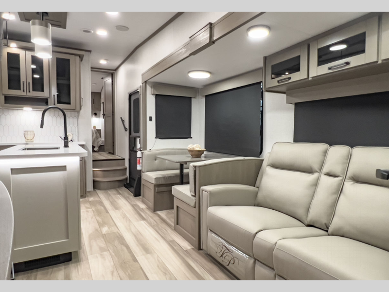 Sleeps 7 Slides 4 Length 39 ft 11 in Ext Width 8 ft Ext Height 12 ft 8 in Hitch Weight 2400 lbs GVWR 14995 lbs Dry Weight 12500 lbs Fresh Water Capacity 74 gals Grey Water Capacity 79 gals Black Water Capacity 79 gals Tire Size ST235/85R16LRE Furnace BTU 35000 btu Number Of Bunks 1 Available Beds Queen Refrigerator Type 12V Refrigerator Size 16 cu ft Cooktop Burners 3 Number of Awnings 2 LP Tank Capacity 30 lbs Water Heater Type On Demand Tankless AC BTU 15000 btu TV Info LR 40" TV Awning Info 13' & 10'6" One-Touch Electric LED Axle Count 2 Number of LP Tanks 2 Shower Type Radius Electrical Service 50 amp Similar Floorplans