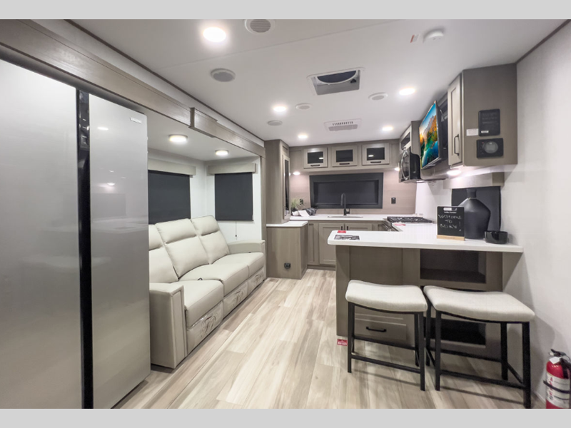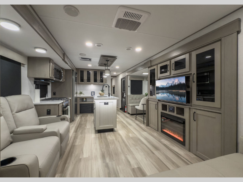 Sleeps 5 Slides 2 Length 35 ft 5 in Ext Width 8 ft Ext Height 11 ft 11 in Hitch Weight 1130 lbs GVWR 10995 lbs Dry Weight 9200 lbs Fresh Water Capacity 55 gals Grey Water Capacity 78 gals Black Water Capacity 39 gals Tire Size ST225/75R15LRE Furnace BTU 35000 btu Available Beds Queen Refrigerator Type 12V Refrigerator Size 16 cu ft Cooktop Burners 3 Shower Size 30" x 48" Number of Awnings 1 LP Tank Capacity 30 lbs Water Heater Type On Demand Tankless AC BTU 28500 btu TV Info LR 40" LED HDTV Awning Info 12' One-Touch Electric LED Axle Count 2 Washer/Dryer Available Yes Number of LP Tanks 2 Shower Type Standard Electrical Service 50 amp Similar Floorplans