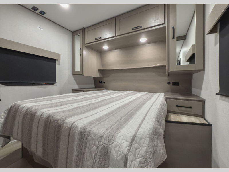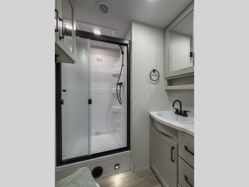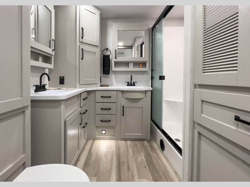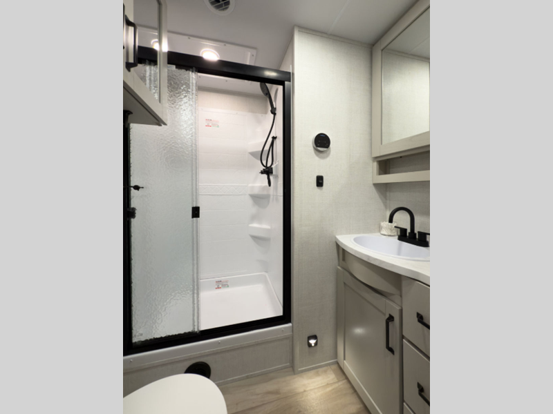 Reflection is built with the Artic 4-Season Protection package which provides a 35K BTU high capacity furnace, double insulated roof and front cap, a heated and underbelly with circulating heat, and 12V heat pads on the holding tanks to mention a few features that allow you to travel during any climate. The interior offers residential cabinetry, a deep seated stainless steel kitchen sink in the gourmet kitchen, a spacious shower with a glass door, and ductless flooring in the living area to name a few comforts.