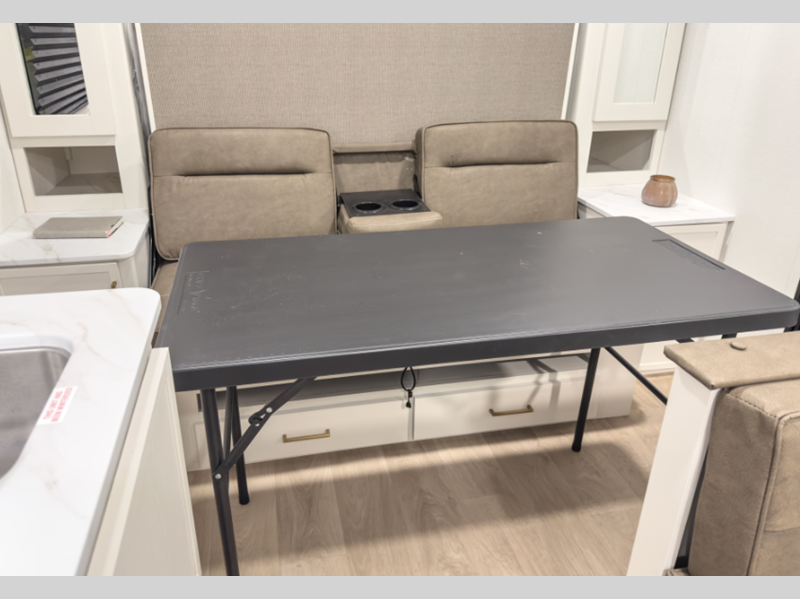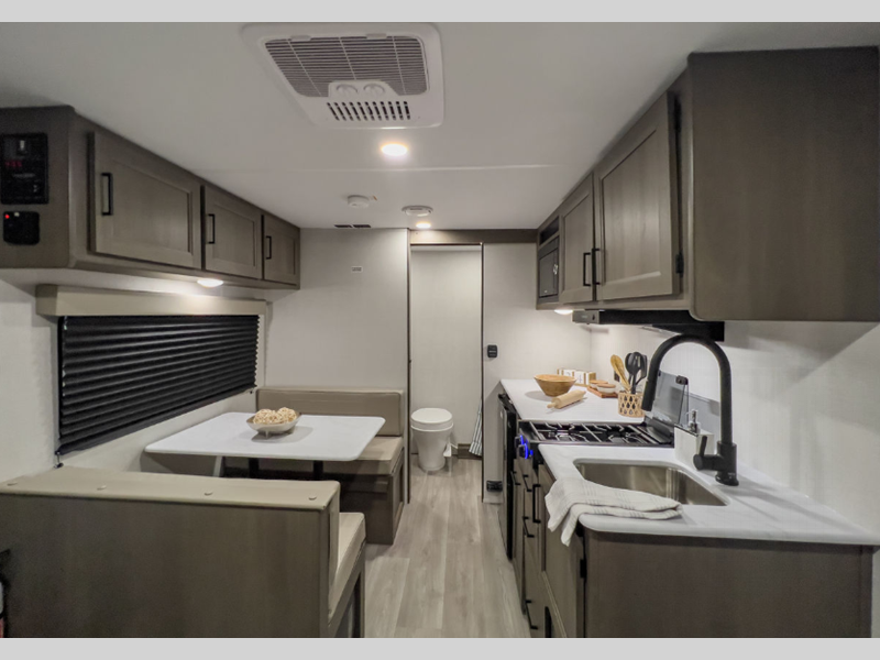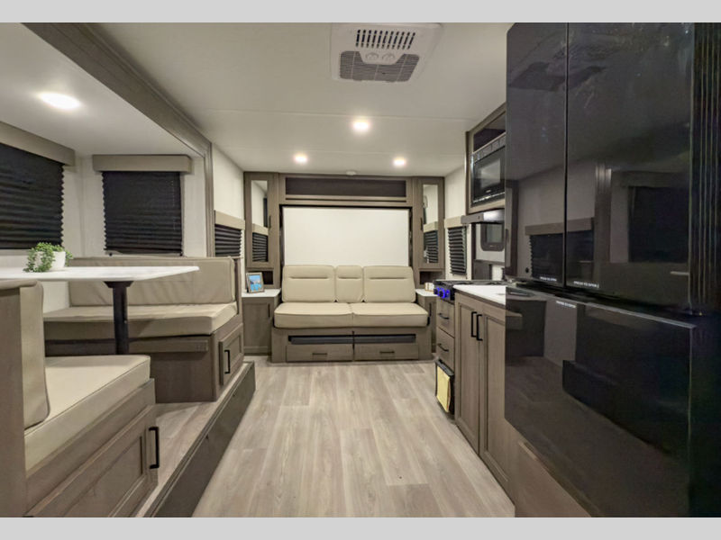 Each model is constructed to a superior standard with an insulated floor and enclosed underbelly plus residential insulated walls that will help with temperature regulation and moisture control. The 6' 6" interior height, tinted windows, and residential cabinet doors will make your space feel a little more like home, and the black automotive glass entry door is ultra sleek. You will find a power awning with a Fusion light outside, along with magnetic storage door catches, a Leash Link/bottle opener, and more convenient features!