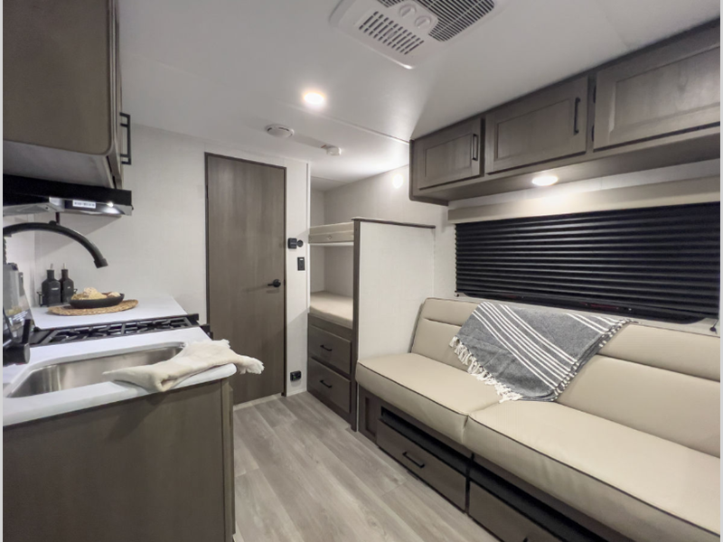 Sleeps 7 Slides 1 Length 23 ft Ext Width 8 ft Ext Height 10 ft 6 in Int Height 6 ft 6 in Hitch Weight 524 lbs GVWR 5500 lbs Dry Weight 4784 lbs Fresh Water Capacity 37 gals Grey Water Capacity 74 gals Black Water Capacity 37 gals Tire Size ST225/75R15LRE Furnace BTU 20000 btu Number Of Bunks 2 Available Beds Queen Murphy Bed Refrigerator Type Glass Front 12V Refrigerator Size 10 cu ft Cooktop Burners 2 Shower Size 27" x 36" Number of Awnings 1 LP Tank Capacity 20 lbs Water Heater Capacity 6 gal Water Heater Type Gas/Electric AC BTU 13500 btu Awning Info 16' Power w/Fusion Light Axle Count 1 Number of LP Tanks 1 Shower Type Walk-In Shower Similar Floorplans