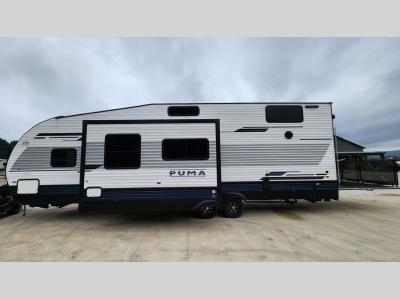 The ultimate travel trailer is found in this Puma! There is ample space to move about thanks to the large slide out and dual entry doors, plus there is a rear patio where you can entertain guests and relax in your camp chairs! The full bath includes a large linen closet to keep bath necessities stocked, and above this room is where you'll find the loft with two bunk mats. The loft looks out on the main living area and kitchen, where you can relax on the sofa, play a game at the booth dinette, and make dinner in the full kitchen. And a front private bedroom provides you with your own space at night!
