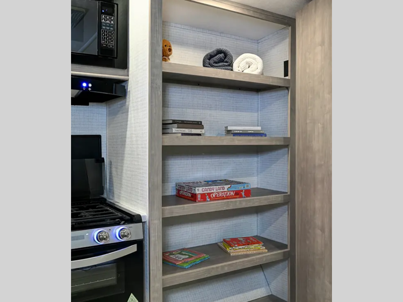 Each model is constructed with a gel coated 3/4 fiberglass cap with diamond plate stone guard, a fully enclosed and heated underbelly, and a fully laminated roof to provide a crowned ceiling. There are smoked glass kitchen cabinet doors inside, along with roller shades, kitchen backsplash, and many more comforts. You'll appreciate the power tongue jack outside to easily hitch up and go, and the 200-watt solar panel will provide some off-grid capabilities!