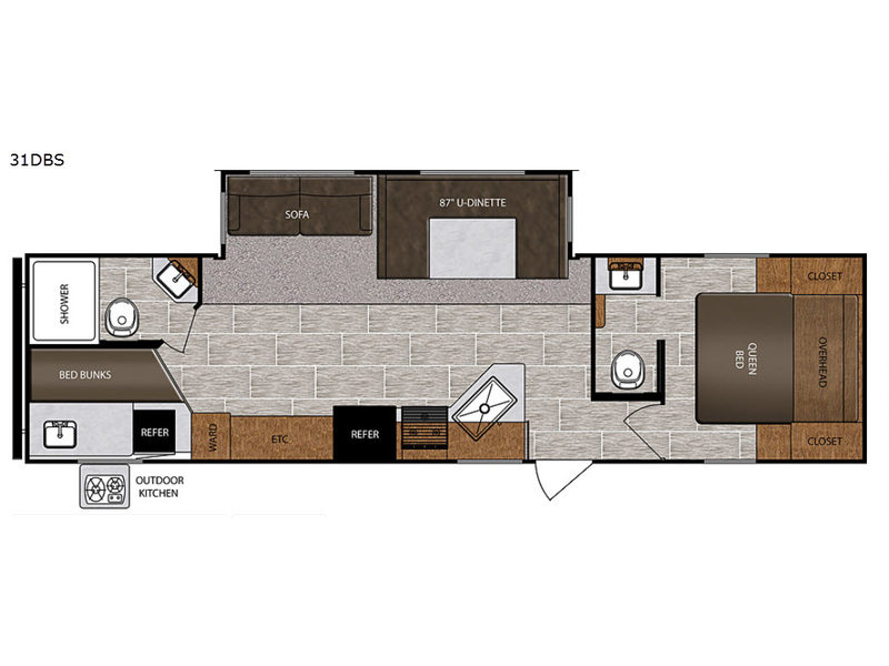 It's time to invite your kids' buddies and all your camping friends to join you on your next campout in this Avenger 31DBS travel trailer. When all your group is relaxing outside the chef in the family can be cooking meals on the outdoor kitchen while the family is resting under the power awning. The kids will surely love their own sleeping arrangements on the double size bunks or when the furniture is turned down for the night. Having access to a rear full bathroom next to the bunks, and a half bath in the front bedroom is convenient for all involved. Take a look today!